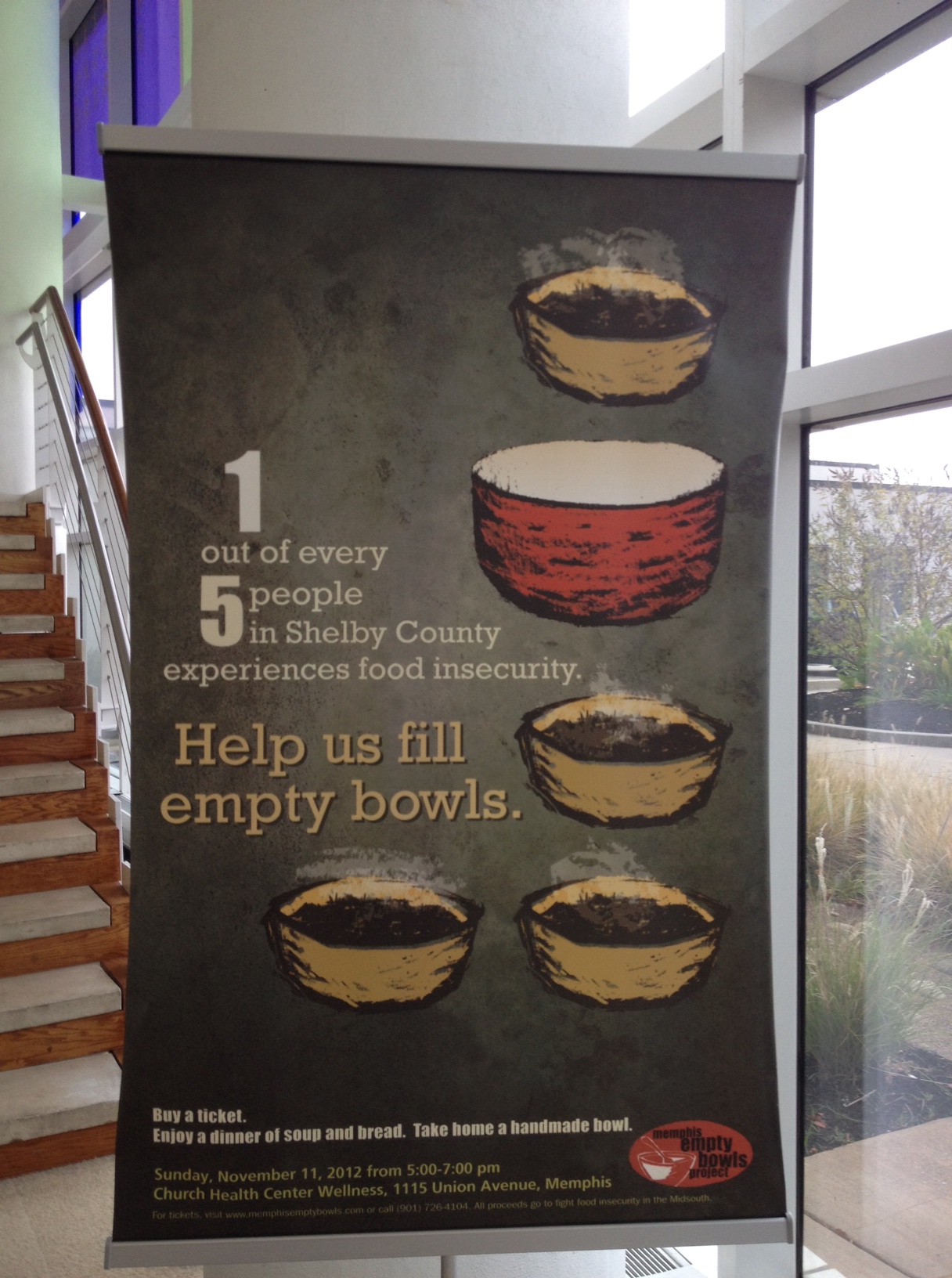 Let me just tell you. I LOVE the Memphis Empty Bowls Project. By first year standards By any standards, I’d call it a huge success. They had at least 60 volunteers with more waiting in the wings, the tickets sold out days before the event, the leftover soup was donated to families in need, they raised $18,000 to fight hunger in the Mid-South, and perhaps most importantly, they raised awareness about the staggering number of men, women and children whose bowls are empty every day.